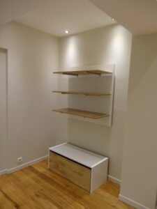 - Mobilier innovant, épuré et modulable selon vos besoins. Il se compose de panneaux muraux blanc mat et d’étagères blanc mat, blanc brillant et chêne.